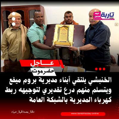تسلم عضو مجلس القيادة الرئاسي محافظ حضرموت الأستاذ سالم أحمد الخنبشي، درعًا تذكاريًا من أعيان وشخصيات مديرية بروم ميفع، وذلك نظير متابعته الحثيثة وتوجيهاته المباشرة التي أسهمت في تشغيل وربط كهرباء المديرية بالشبكة العامة.